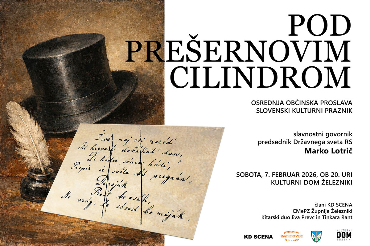 Prireditev Pod Prešernovim cilindrom bo v soboto, 7. februarja 2026, ob 20. uri, v kulturnem domu v Železnikih.